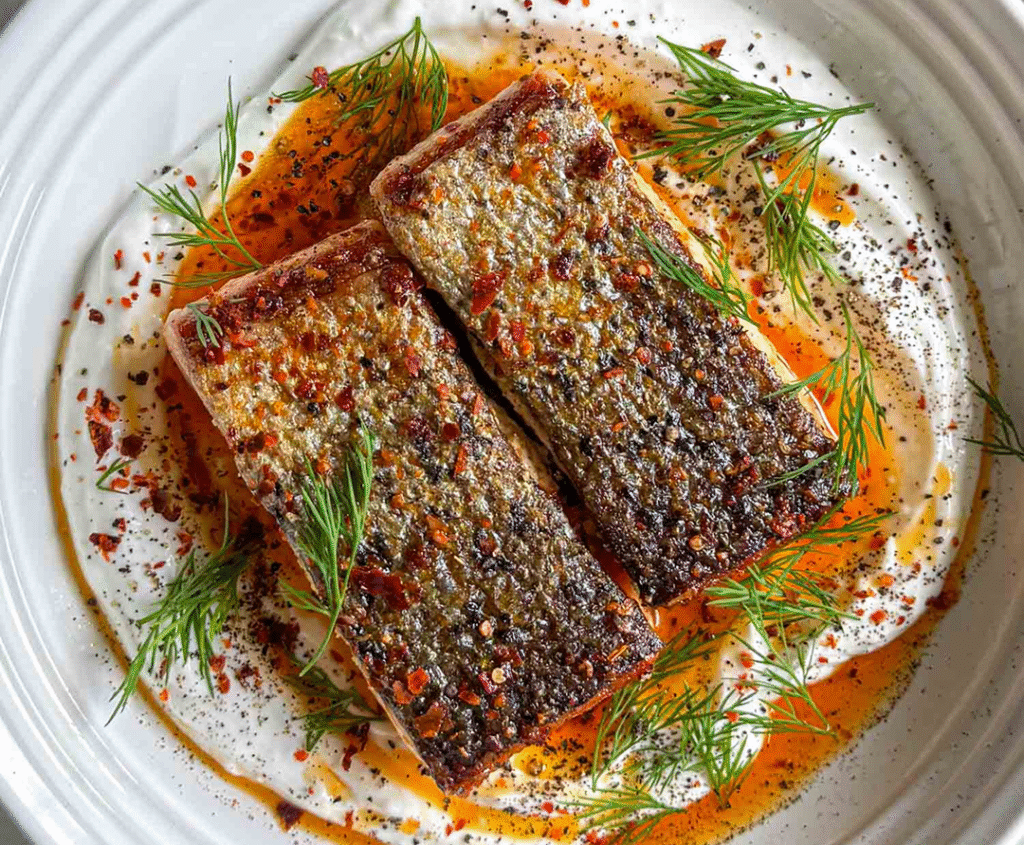 เมนูนี้ได้รับแรงบันดาลใจจากอาหารตุรกี ที่มีเสน่ห์ด้วยการผสมผสานเนื้อปลาแซลมอนอาร์กติกที่กริลล์จนผิวกรอบ หอมละมุน เข้ากับโยเกิร์ตกระเทียมที่นุ่มนวล และเนยเครื่องเทศรสเข้มข้น ไฮไลต์คือความตัดกันระหว่างผิวปลากรอบ ๆ กับซอสครีมเนียน ที่ช่วยเสริมรสชาติให้กลมกล่อมลงตัว
